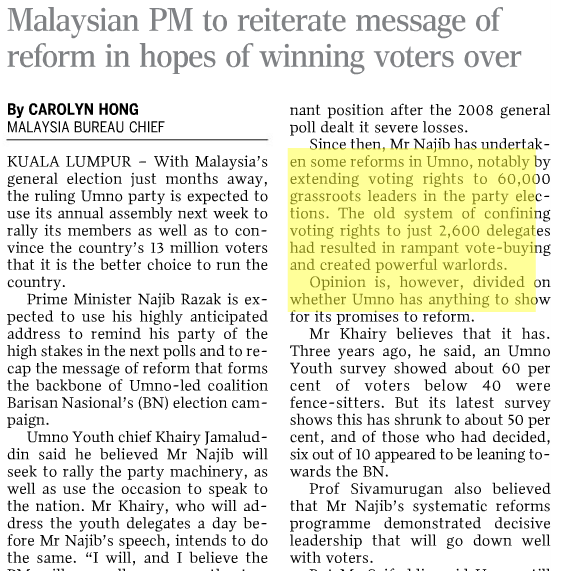 The crux in Malaysia is that a defined maximum variation (normally 10-15%) has been taken out of the constitution and that it can reach several hundred percent. Sure, the rural constituencies in Sabah and Sarawk are difficult to administer, but Indonesia is geographically even more difficult and has managed the parliamentary and presidential elections this year much better.The Malaysian Election Commission is handpicked by the government anyway, but it does not look good that its former chairman has joined the Barisan National’s right-wing support group Perkasa.