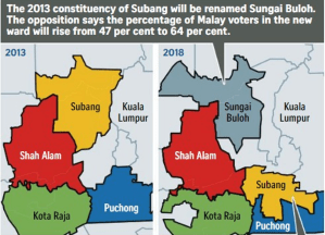It looks debatable whether the redrawn boundaries are strictly following the demographic changes. If the opposition is right, they do follow ethnic patterns as well, like in Subang close to Kuala Lumpur. The borders, at least, look increasingly complicated and salamander-like as shown in this 2013 – 2018 comparison.